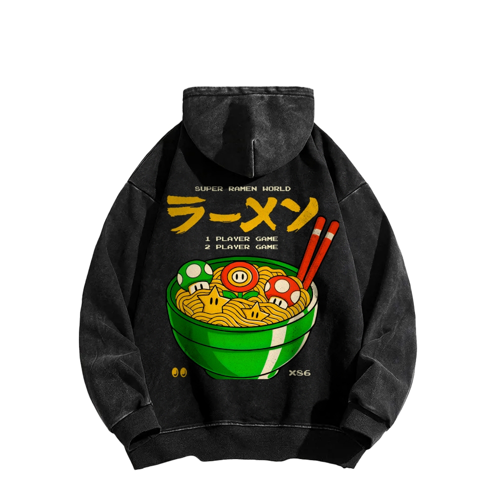 Super Ramen World Front And Back Printing Vintage Washed Hoodie$48.95 USD