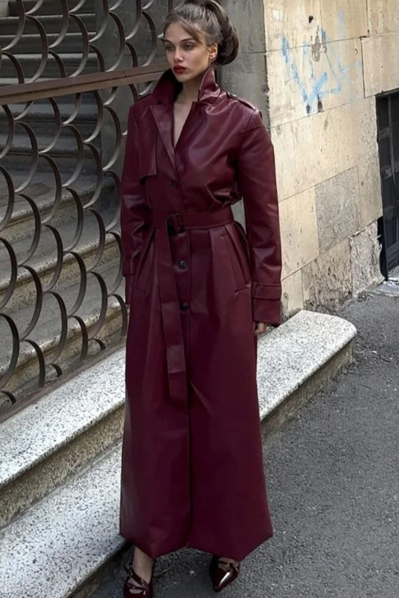Ladies' Notched Lapel Belted Long Faux Leather Coat$72.99 USD$92.99 USD