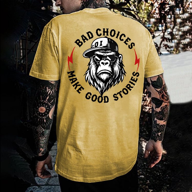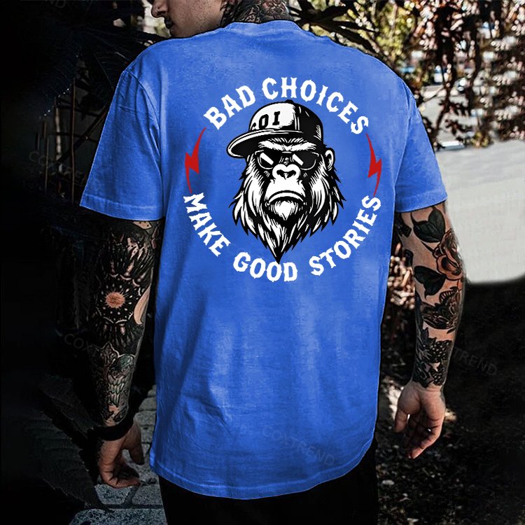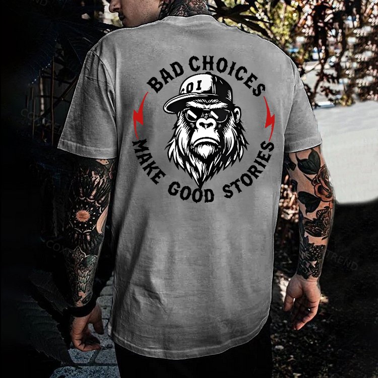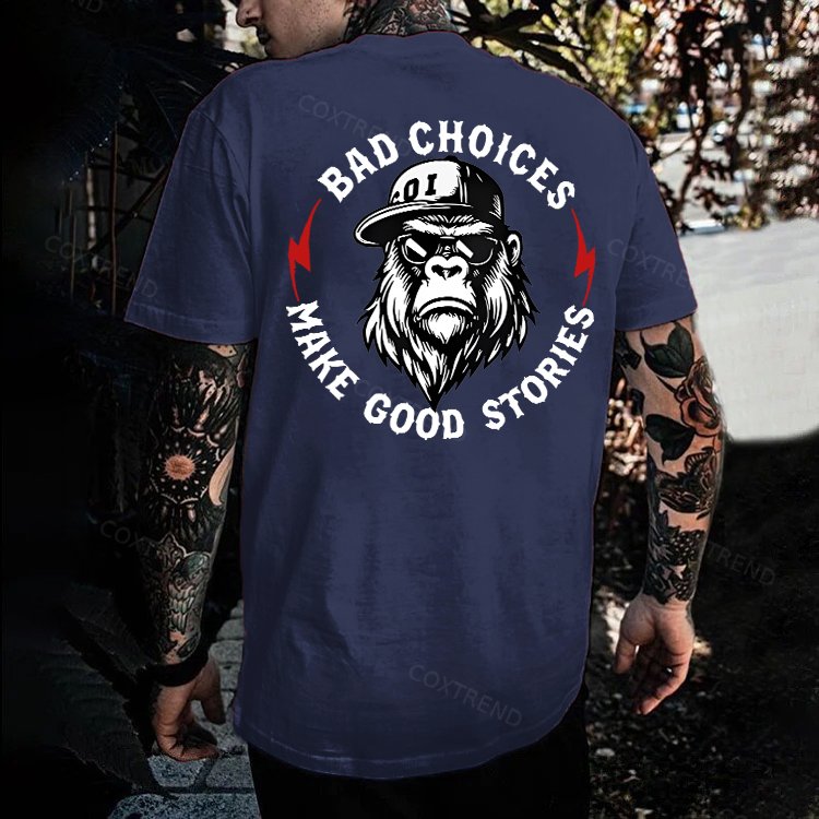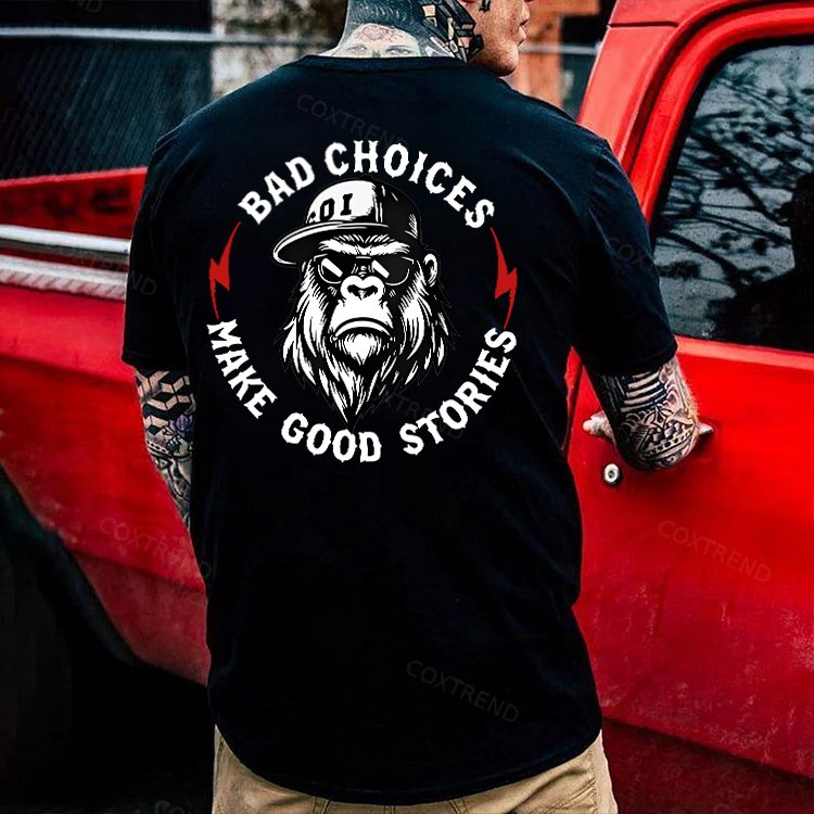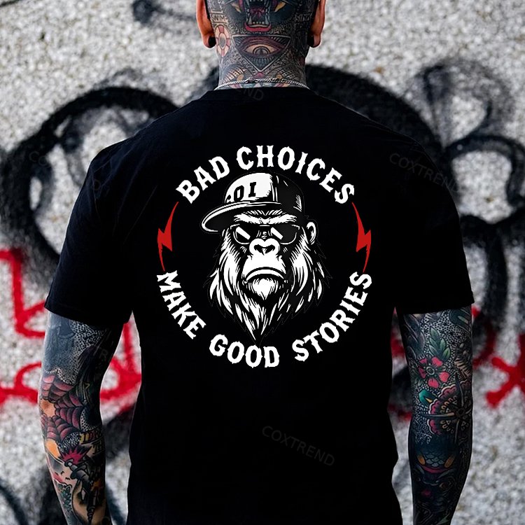 Design Concept:The graphic shows a tough, confident gorilla with the phrase “Bad Choices Make Good Stories.” Combined, it suggests a positive outlook: life’s mistakes and bold decisions can become meaningful experiences that help us grow, learn, and build unforgettable memories.------COXTREND.COM