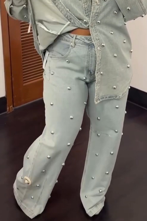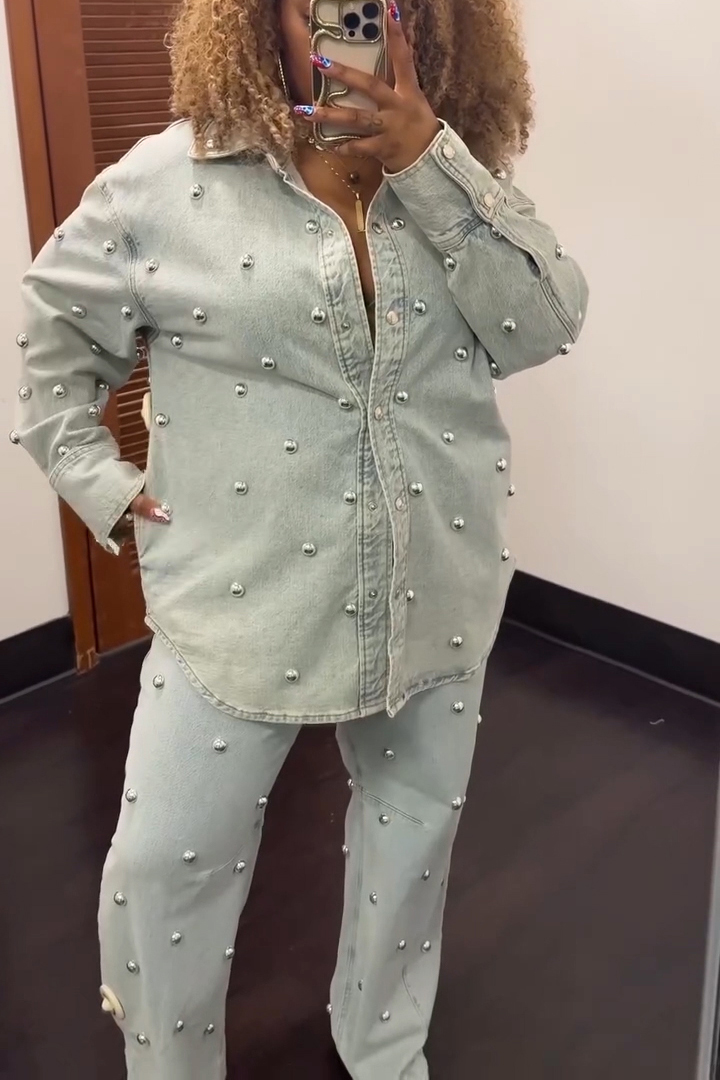 Designer Metal Bead Washed Denim Jacket + Wide Leg Jeans