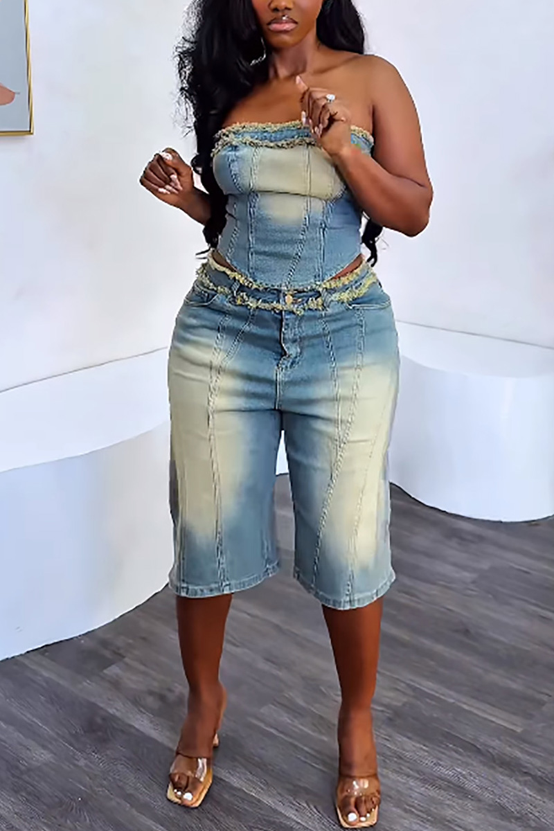 Distressed Trim Bustier Top + High Waist Denim Shorts Set