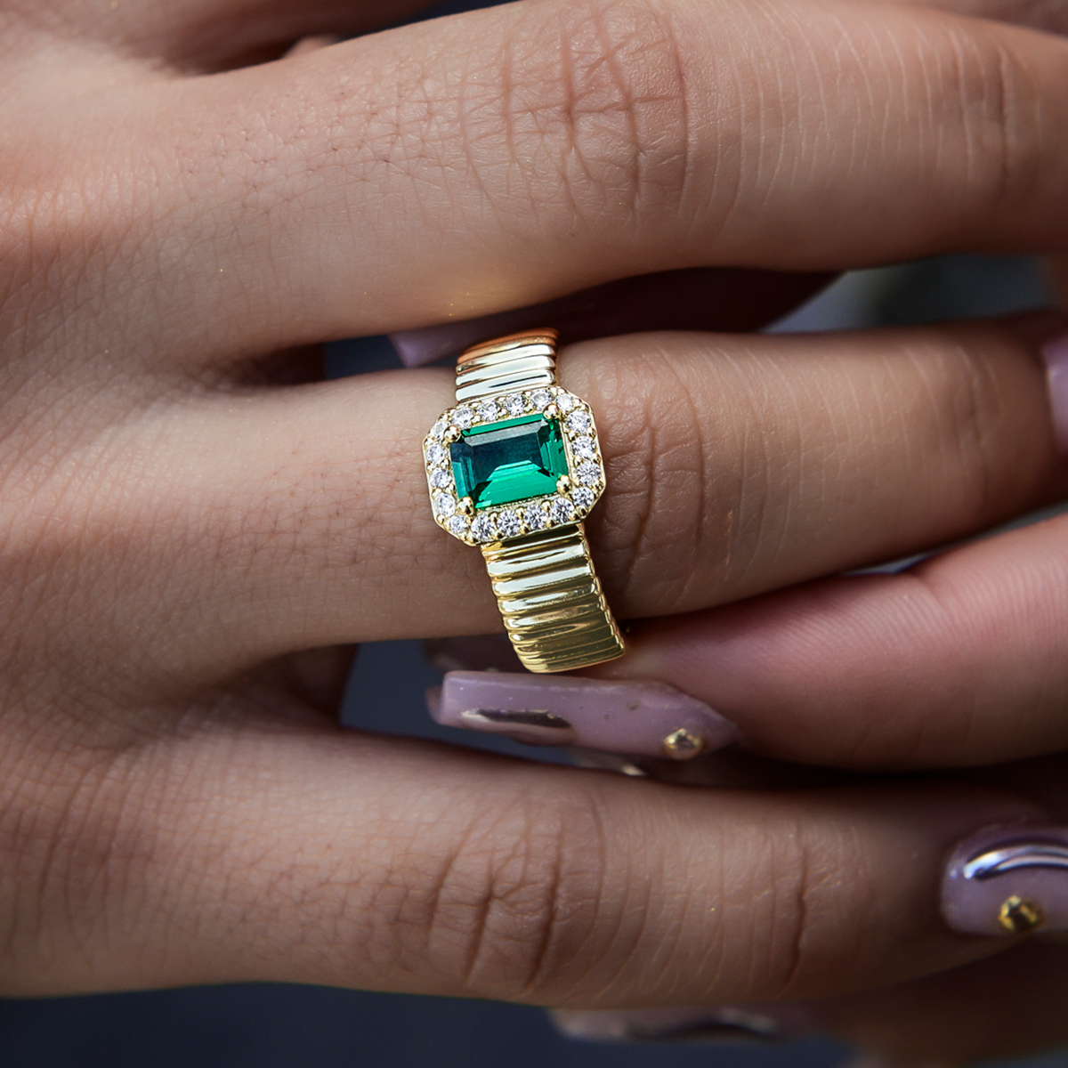 Introducing the Emerald Textured Ring in 18k Gold Vermeil. This piece is sure to make a statement featuring a pave hand-set halo around an emerald stone, accentuated by a textured band. Elevate your style with this meticulously crafted piece, it pairs perfectly with the Emerald Cushion Cut Earrings!