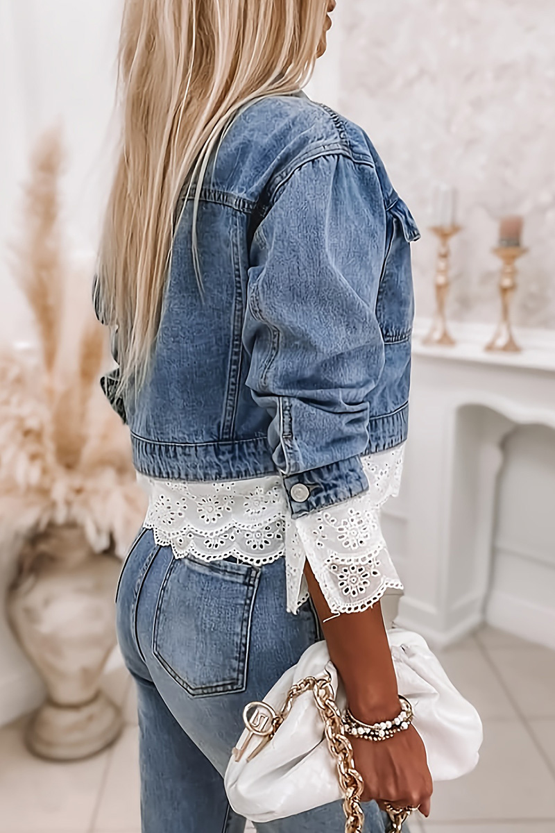 Ladies Multilayer Lace Trim Long Sleeve Denim Jacket