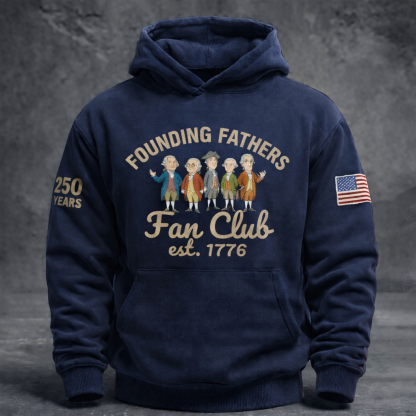 - The front showcases a whimsical "Founding Fathers Fan Club" graphic, with cartoon illustrations of America’s founding leaders and the text "est. 1776" for a nostalgic vibe.