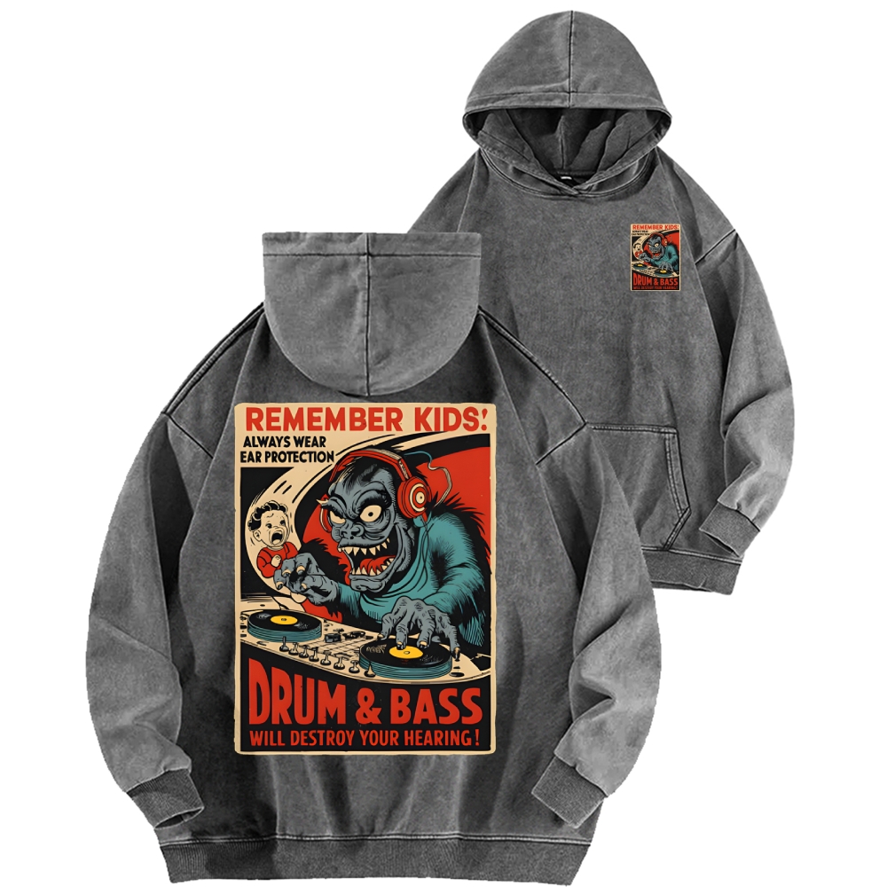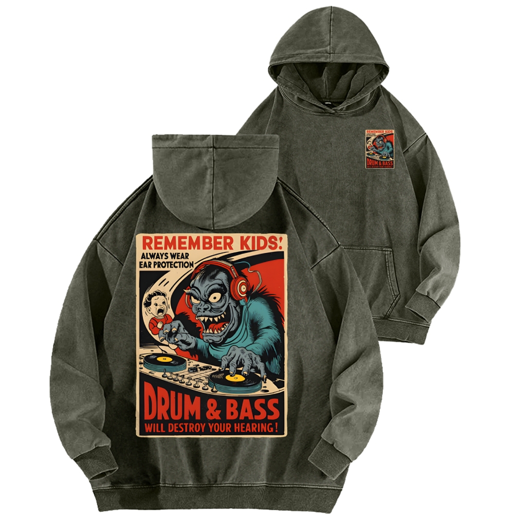 Remember Kids - Drum and Bass Will Destroy Your Hearing Front And Back Printing Vintage Washed Hoodie