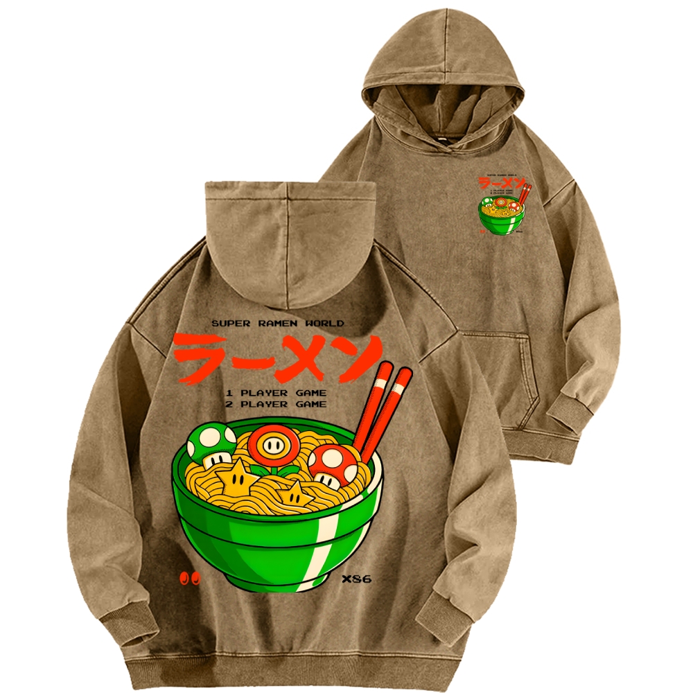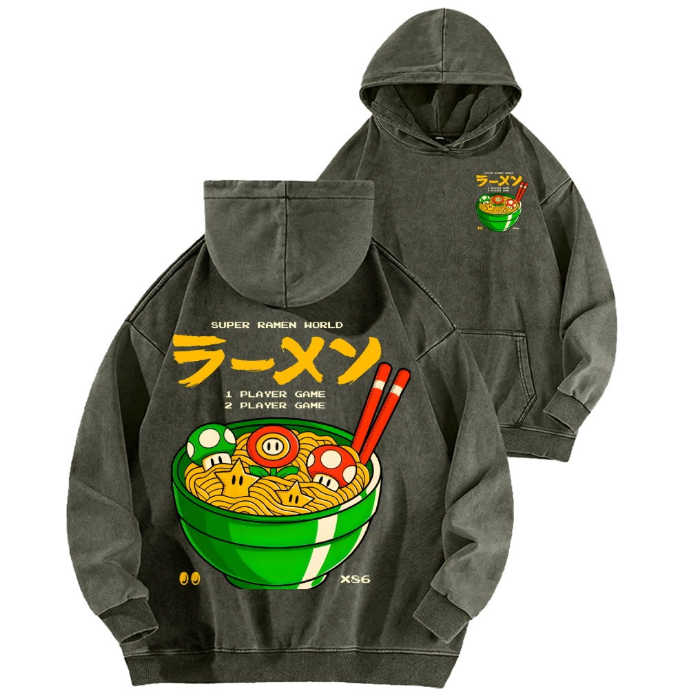 Super Ramen World Front And Back Printing Vintage Washed Hoodie