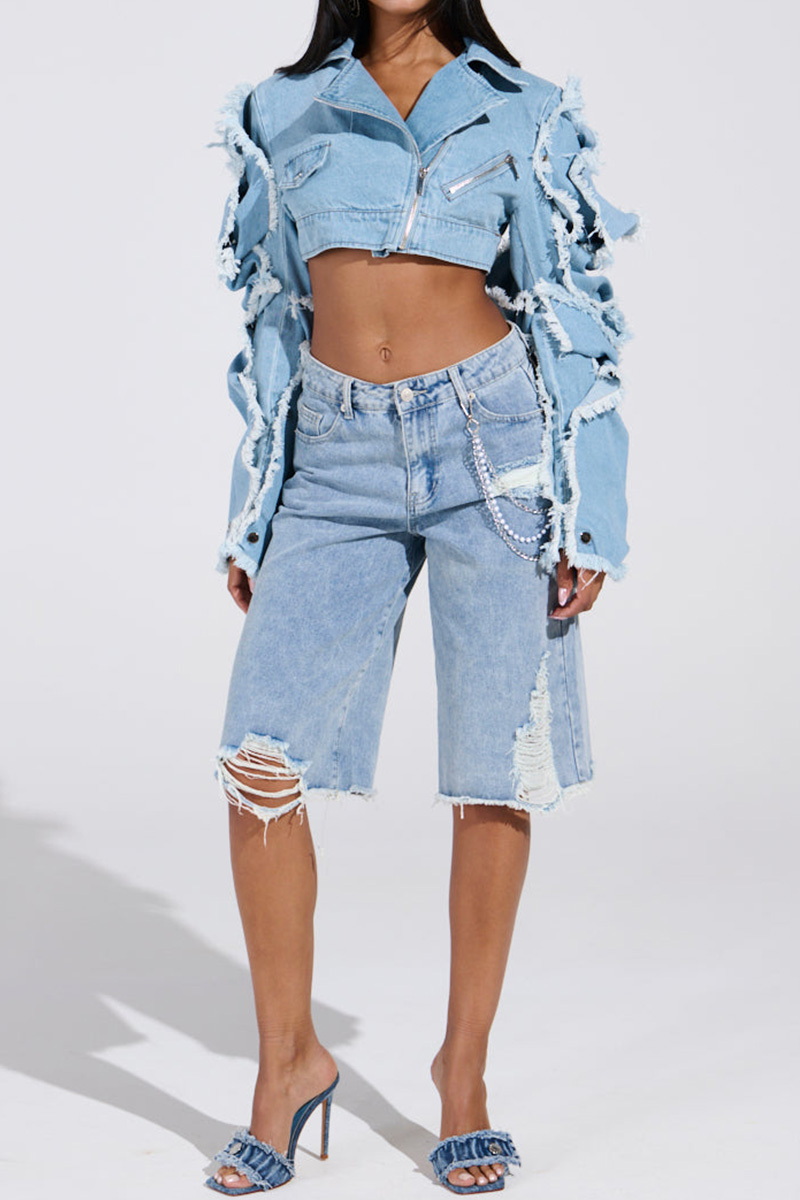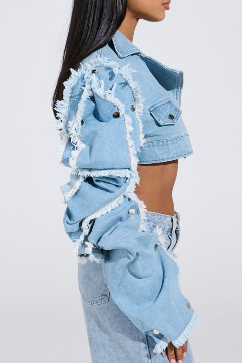 Women's Asymmetrical Sleeve Ripped Denim Jacket With Hem