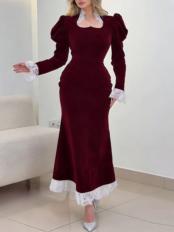 Elegant Puff Sleeve Belted Ruffle Hem Denim Midi Dress